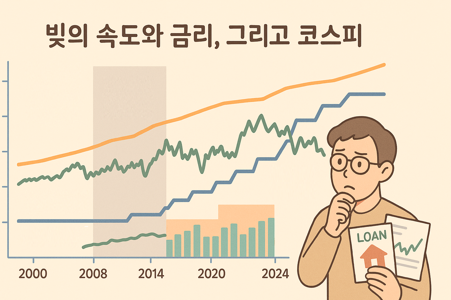 서론에서 우리가 확인하고 싶은 포인트는 명확합니다. “금리와 코스피의 관계”만 보는 것은 반쪽짜리 이해이고, 그 사이에 “가계부채”라는 세 번째 축을 더해야 비로소 한국 시장의 특성이 보인다는 것. 같은 1%p 금리 인상이라도, 부채가 적던 시기와 부채가 고점일 때의 체감 충격은 다릅니다. 그 차이가 소비 위축, 부동산 거래 급감, 신용 축소, 그리고 주식시장 유동성 감소로 번져 나갑니다. 이 글의 목적은 독자에게 공포를 심어주는 것이 아니라, “지금 우리는 어느 정도 레버리지 환경에 살고 있고, 금리 변화가 코스피에 어떤 경로로 도달하는지”를 한 번 현실적으로 점검해보자는 데 있습니다. 이제 본론에서는 몇 개의 대표적인 구간을 나누어, 가계부채·금리·코스피 그래프가 어떻게 엇갈리고 겹쳐졌는지 차근차근 살펴보겠습니다.
