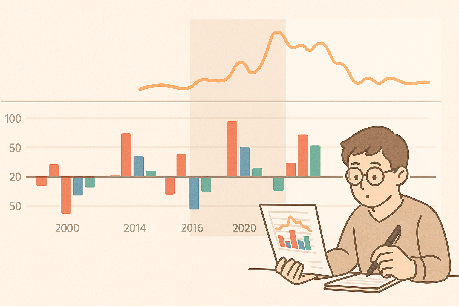 실제 블로그 글에서 이 내용을 시각적으로 전달하려면, 다음과 같은 구성을 추천합니다. x축에 2000년대 초반부터 최근까지의 연도를 나열하고, 상단에는 국제 유가(연평균 혹은 연말 기준)를 선 그래프로 나타냅니다. 이 선은 부드러운 곡선 형태로 연결해 유가 사이클의 큰 흐름(급등·급락·박스권)을 한눈에 보여줍니다. 그 아래에는 같은 연도 축을 공유하는 막대그래프를 배치하고, 정유·항공·화학 섹터의 연간 수익률을 나란히 놓습니다. 예를 들어 연도별로 세 개의 막대를 배치하되, 빨간 막대는 정유, 파란 막대는 항공, 초록 막대는 화학으로 두면 구분이 쉽습니다.