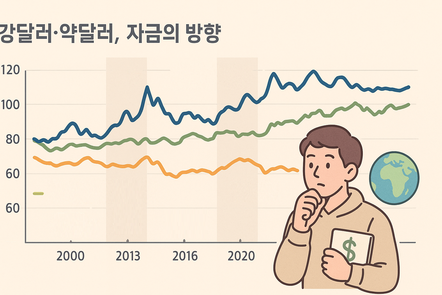 한국 투자자라면 뉴스에서 “강달러”, “약달러”라는 표현을 수도 없이 접합니다. 하지만 막상 내 계좌와 연결해서 생각해 보려고 하면, 막연히 “달러 강세면 신흥국 힘들다더라”, “달러 약세면 주식시장이 좋다더라” 정도의 문장만 떠오르는 경우가 많습니다. 이 글은 그 막연함을 조금이라도 줄이기 위해, 달러 인덱스(DXY)와 코스피·신흥국 증시(MSCI EM 등)의 수익률을 한 그래프 안에 올려놓고 비교해 보려는 시도입니다. 강달러가 이어지던 구간, 약달러로 방향이 바뀌던 구간, 달러가 박스권을 그리던 구간마다 신흥국 증시와 코스피가 어떤 모양의 곡선을 그렸는지, 연도별 흐름을 이야기하듯 풀어볼 예정입니다. 그 과정에서 “달러 인덱스가 꼭지일 때 증시는 어떤 위치였는지”, “달러가 약해지기 시작할 때 외국인 자금은 어디로 향했는지” 같은 질문에 대한 감을 함께 잡아가게 됩니다. 이 글의 목적은 환율 전문가가 되는 것이 아니라, 달러 인덱스의 큰 흐름을 한눈에 보는 것만으로도 내 포트폴리오의 방향을 조금 더 현명하게 정할 수 있도록 돕는 데 있습니다.