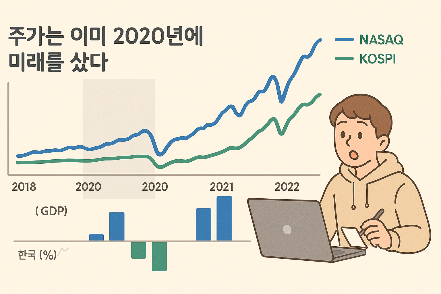 이 내용을 블로그에서 시각적으로 표현하려면, 시간축을 공유하는 두 개의 지표를 한 화면에 담는 구성이 좋습니다. 예를 들어 x축에 2018~2022년을 놓고, 왼쪽 y축에는 KOSPI와 나스닥의 지수(또는 2018년 = 100 기준 상대수익률)를 선 그래프로, 오른쪽 y축에는 한국·미국 GDP 성장률을 막대그래프로 배치할 수 있습니다. 2020년 구간에는 옅은 회색 음영 박스를 씌워 “팬데믹 충격”이라고 표시하고, 그 안에서 3월 폭락과 하반기 신고가 구간에 각각 작은 주석을 달아 “공포의 저점”과 “역대급 V자 반등”을 강조합니다.