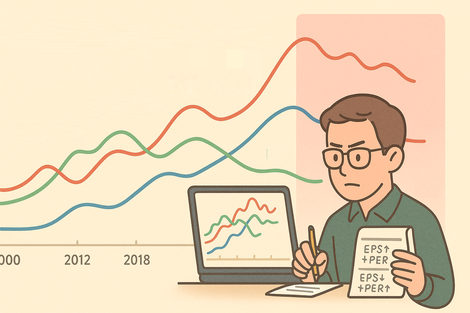 서론에서 먼저 짚고 싶은 포인트는 단순합니다. “PER이 높다/낮다”라는 말만으로는 부족하고, 그 PER가 어떤 EPS 사이클 위에서 형성된 것인지 함께 봐야 한다는 것입니다. 이익이 막 늘어나기 시작하는 초기 국면에서 PER이 일시적으로 높게 보이는 것은 자연스러운 일일 수 있습니다. 반대로 이익이 이미 피크를 찍고 꺾이기 시작했는데도 PER이 역사적 평균 이상에서 버티고 있다면, 그 구간은 향후 조정 위험을 키우는 경고일 수도 있습니다. 이 글의 본론에서는 몇 개의 대표적인 조합을 통해, “코스피 지수, EPS, PER” 세 줄이 만들어낸 장면들을 하나씩 복기해 보겠습니다.