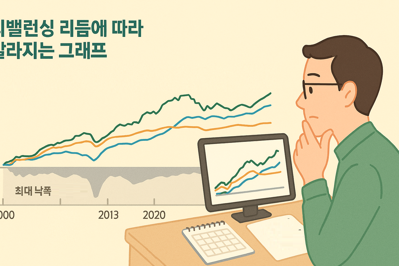이 모든 얘기를 한 번에 정리해 보고 싶다면, 엑셀이나 구글 시트에서 가상의 60/40 포트폴리오를 만들고, 다른 시나리오별 그래프를 그려 보세요. ① 연 1회 리밸런싱, ② 5년 동안 방치, ③ -20% 폭락 시에만 비중 조정 같은 규칙을 정해 놓고, 과거 20년간의 주식·채권 연간 수익률을 대입해 보는 것입니다. 그러면 각 포트폴리오의 누적 수익률 선과 최대 낙폭 그래프가 자연스럽게 만들어집니다.