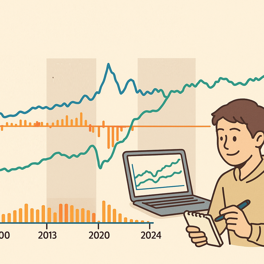 이 패턴을 블로그나 리포트용으로 직접 시각화하려면, 연도별 데이터를 세 열로 정리하면 됩니다. ① 원·달러 환율 (연평균 또는 월평균) ② 외국인 순매수 금액 (KRX 통계 참조) ③ 코스피 지수 (연말 또는 월말 기준) x축은 연도, 왼쪽 y축은 환율, 오른쪽 y축은 외국인 순매수, 그리고 코스피를 별도 색으로 표시합니다. 또한 위기 구간에는 회색 음영 박스를, 회복 구간에는 옅은 초록 음영을 넣어, “달러 강세 → 외국인 이탈 → 코스피 하락”과 “달러 약세 → 외국인 귀환 → 코스피 상승”의 흐름을 시각적으로 구분할 수 있습니다.
