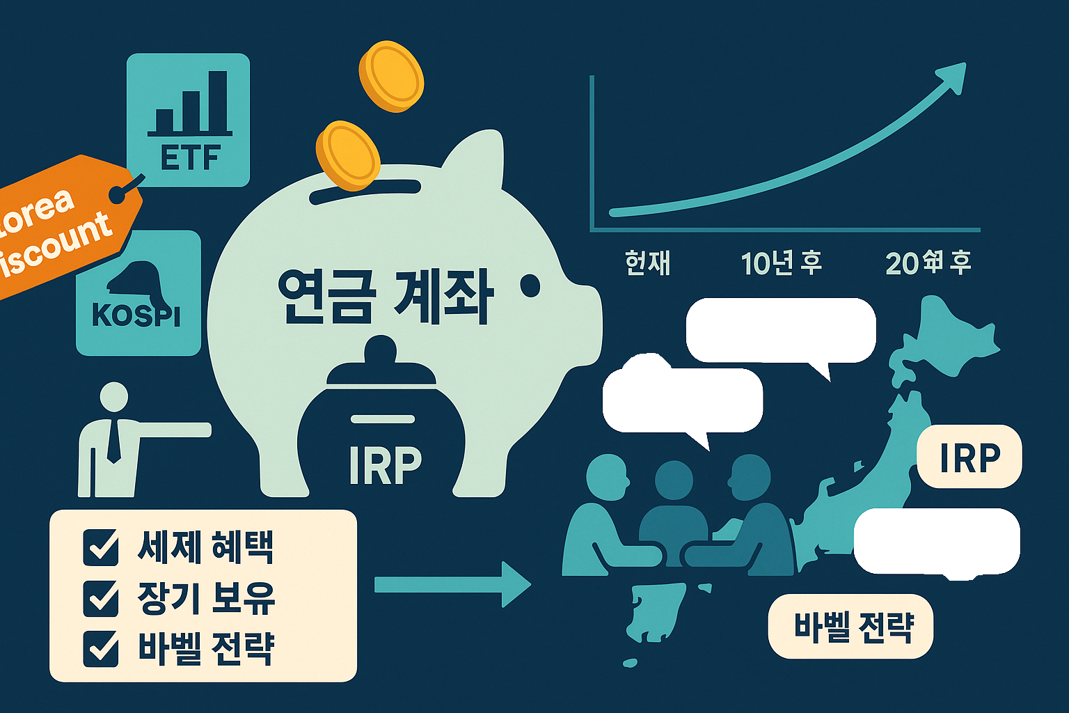 이 딜레마 속에서 개인 투자자가 할 수 있는 가장 현실적인 선택 중 하나가, 바로 코리아 디스카운트를 연금저축·IRP 같은 장기 계좌와 결합시키는 것입니다. 연금 계좌는 구조적으로 “오래 들고 가는 자산”을 담기 위해 만들어진 그릇이고, 코리아 디스카운트는 “당장은 답답하지만 언젠가 풀릴 수 있는 할인”입니다. 둘을 합치면, 논리가 꽤 명확해집니다. “언제 풀릴지 모르는 할인이라면, 단기 계좌보다 연금 계좌처럼 애초에 10년 이상 묶어둘 수 있는 계좌에 담는 게 더 낫지 않을까?”라는 생각입니다.