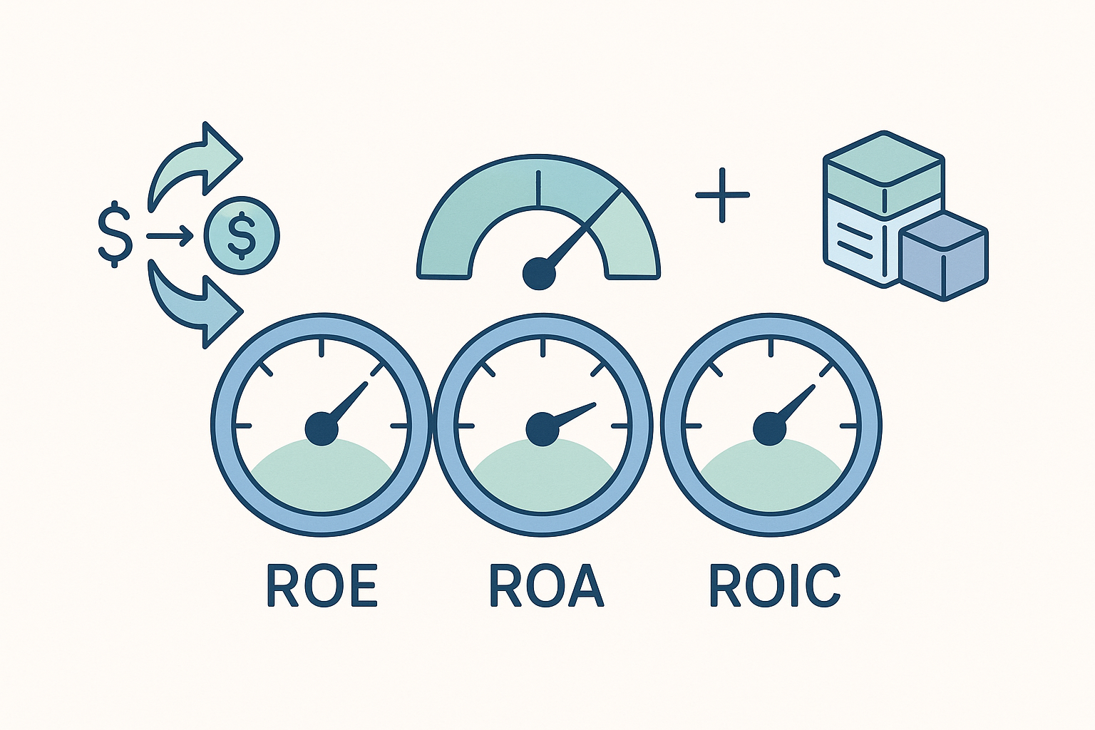 ROE(순이익/자기자본)는 주주의 시선, ROA(순이익/총자산)는 경영 효율의 시선, ROIC(NOPAT/투하자본)는 사업 자체의 시선을 제공합니다.